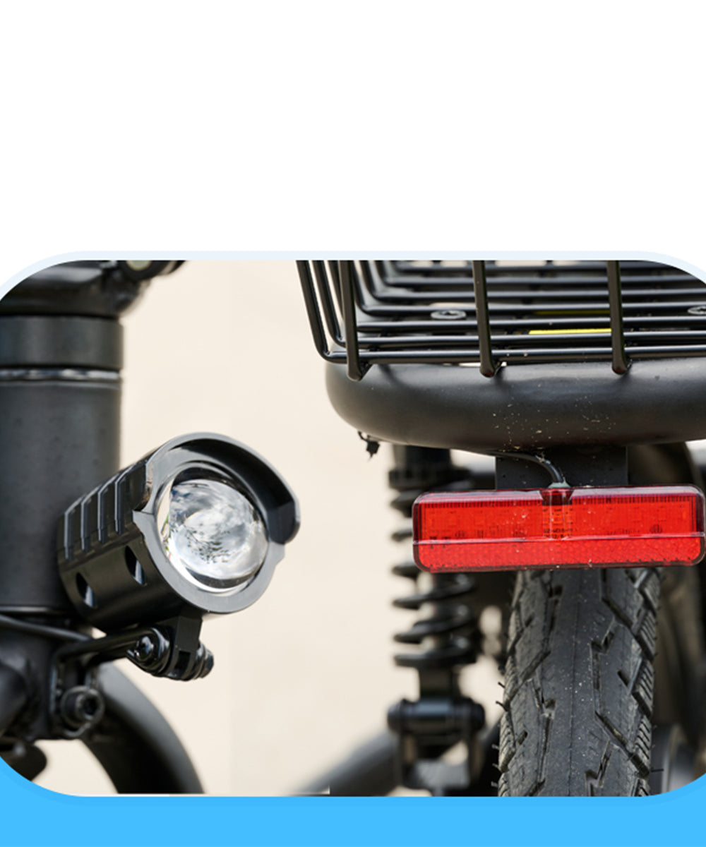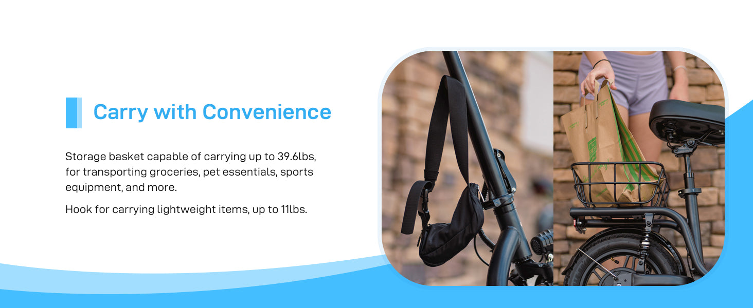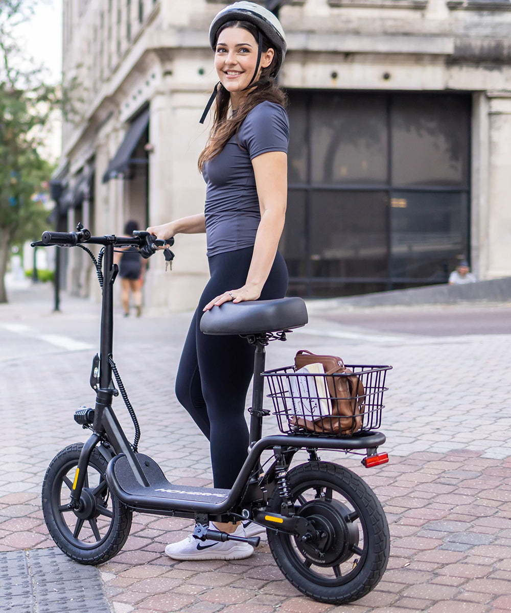 Dual rear suspensions, full brakes, an adjustable seat, a power display, and a lightweight design. It's eco-friendly, convenient for errands and shopping.