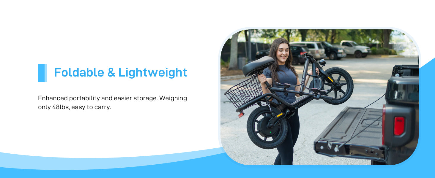 With a 400W motor, 14inch fat tire, and a sturdy frame, it can handle rough terrain at up to 15.5 mph while supporting riders up to 265lbs.