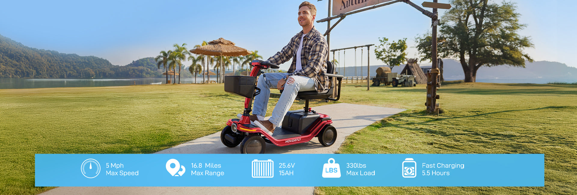 The Hoverfly T4 mobility scooter comes with a lightweight battery pack only 21lbs. 12.4 miles on a single charge and last for years.