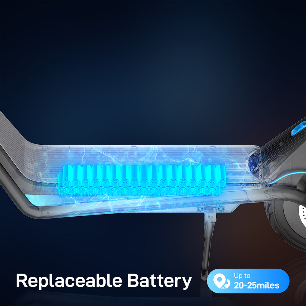 The adult electric scooter features a 36V 12AH battery, enabling it to traverse up to an impressive 25 miles on a single charge, allowing for longer rides without frequent recharging.